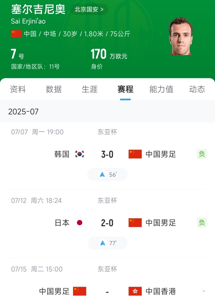 07月12日讯 东亚杯第2轮,中国男足0-2负于日本队,本场比赛塞尔吉尼奥替补出战13分钟,没能贡献进球或助攻。